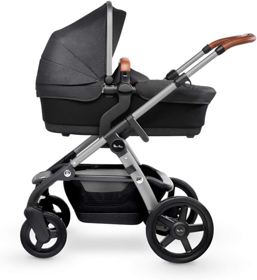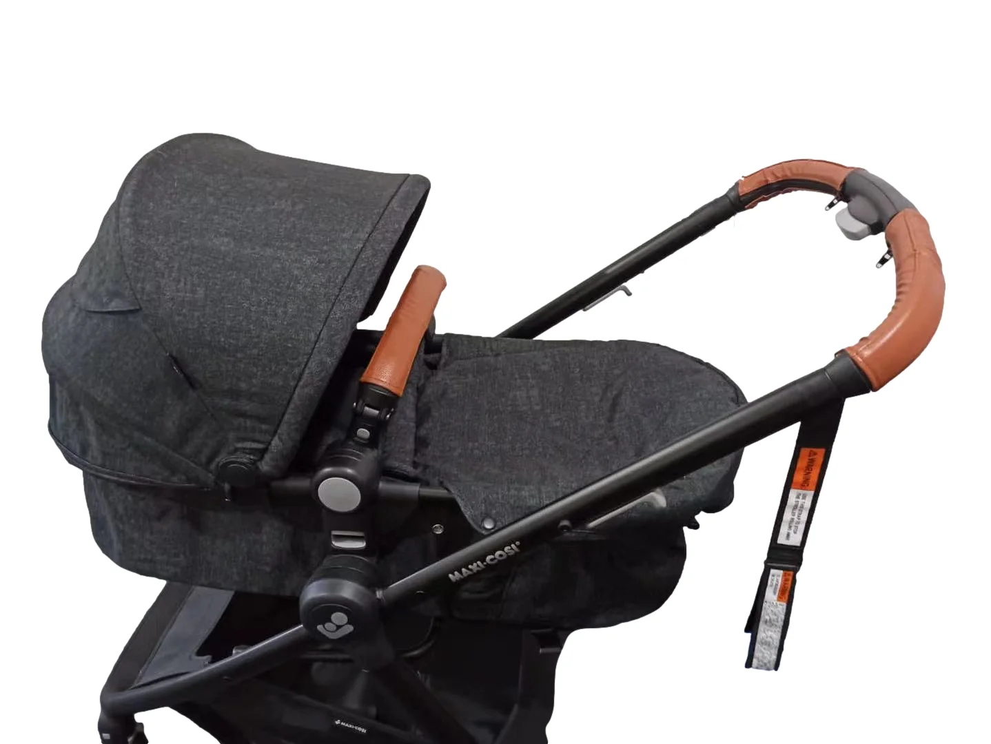 grey pram with brown leather handle