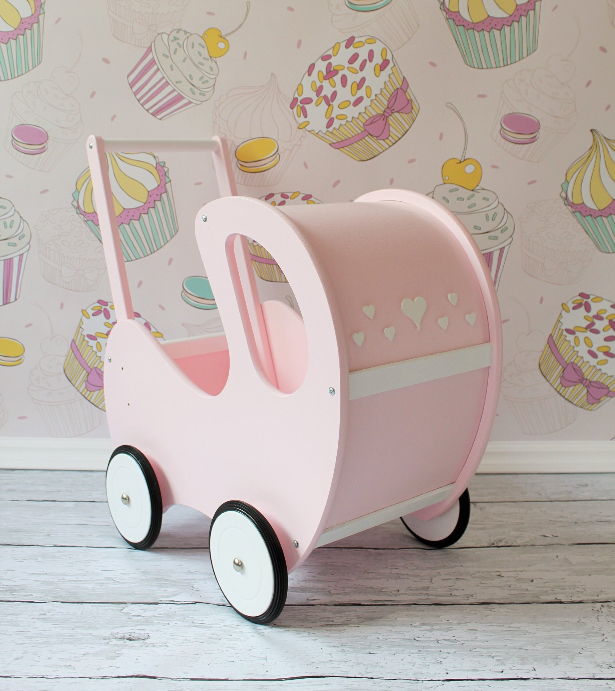 pink wooden doll pram