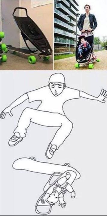 stroller and skateboard