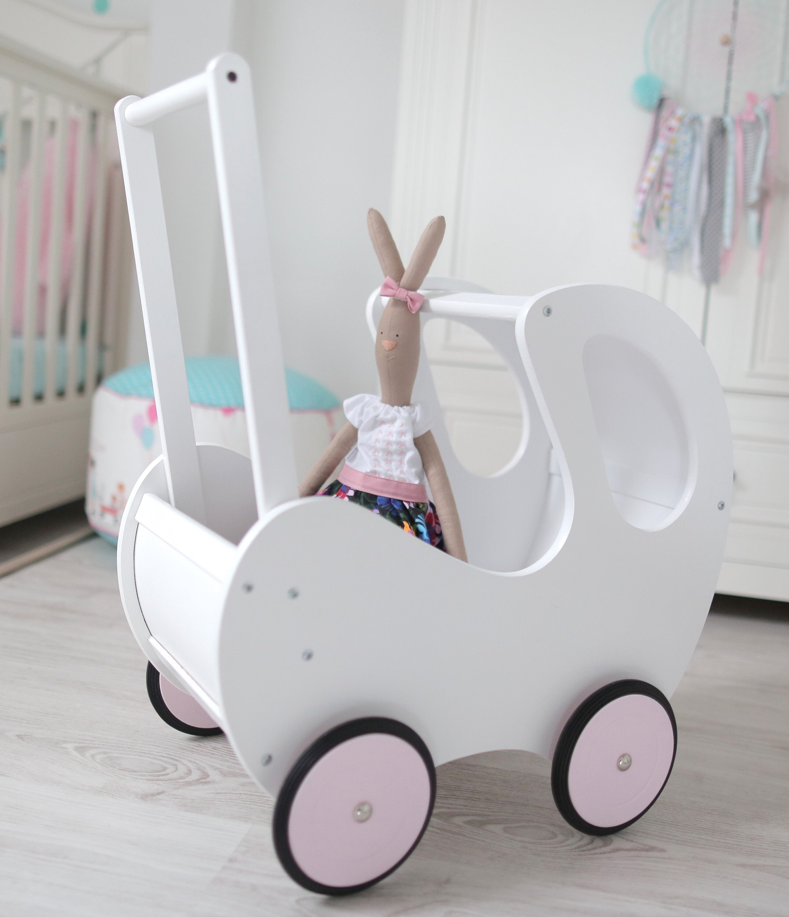 white wooden toy pram